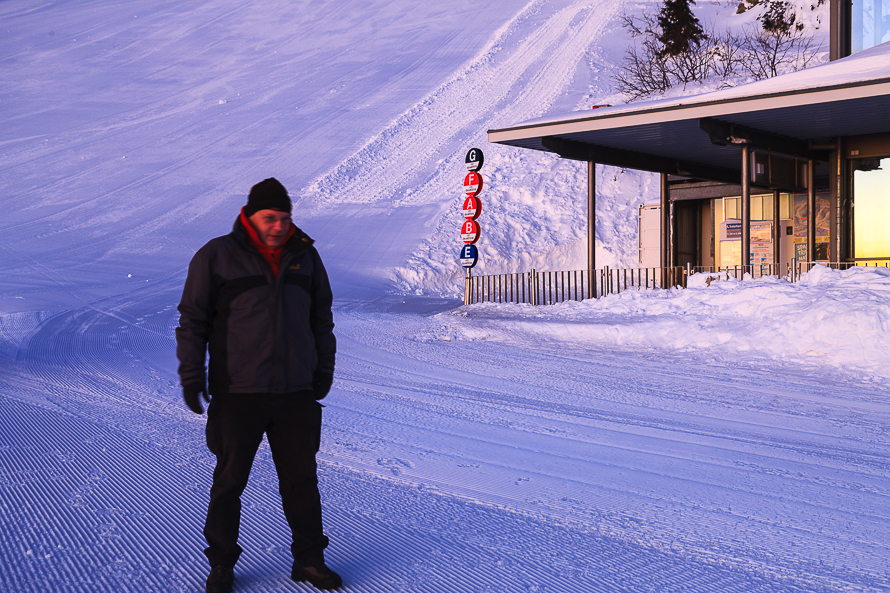 Ganz früh am Morgen an der Bergstation der Arberbahn. Kalt und noch blaues Licht im Winter.