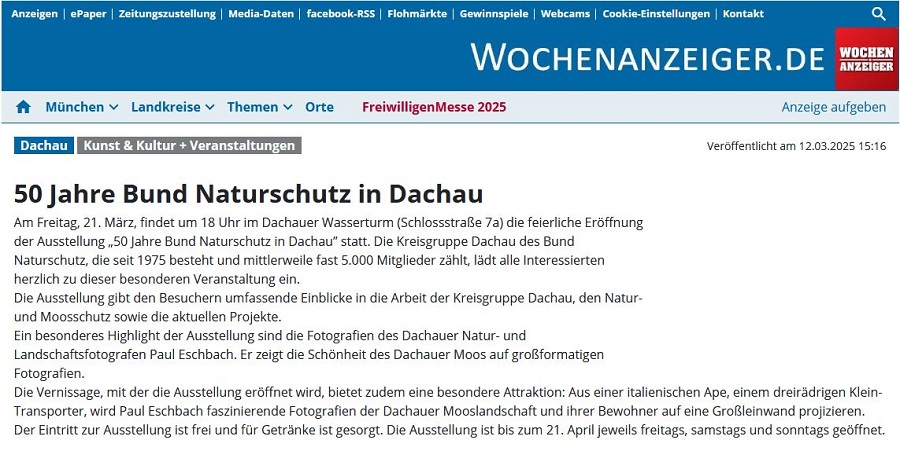 Wochenanzeiger_Dachau_Ausstellung_Wasserturm_2025 Published 16. März 2025 at 900 × 451 in Wochenanzeiger.de Dachau: 50 Jahre Bund Naturschutz in Dachau