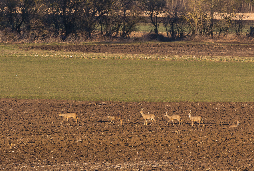 Die Gruppe Rehe fühlt sich inmitten des großen, weiten Ackers wohl sicher. Jede Gefahr kann man von weiten her sehen und so stehen die Rehe oder liegen ganz ruhig. So kann man auch über die große Entfernung hinreichend scharfe Fotos machen. Auch wenn hier wieder das Fell sich nur noch kaum vom braunen Acker abhebt.