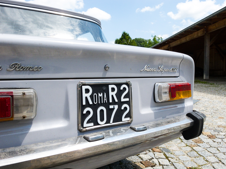 Und da steht schon eine automobile Ikone, wie in einem schwarz/weiß Film in Italien, mit den italienischen Leinwandhelden und Heldinnen. Eine Alfa Romeo Giulia Nuovo Super 1300 mit Kennzeichen aus Rom steht am Wegesrand.