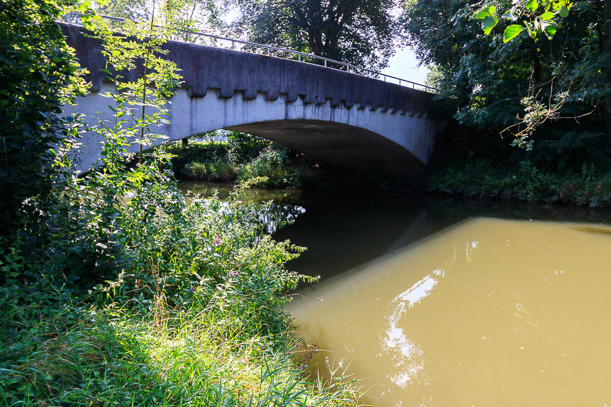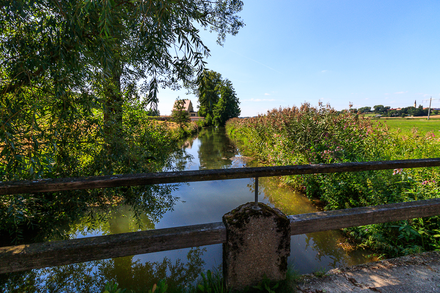 Die Glonn ist hier schon sichtbar schmäler geworden und führt kaum noch biel Wasser – die Fließgeschwindigkeit ist fast stehend. Wir bleiben auf einer kleinen Brücke über einen Glonn Zufluß stehen und betrachten die Landschaft.