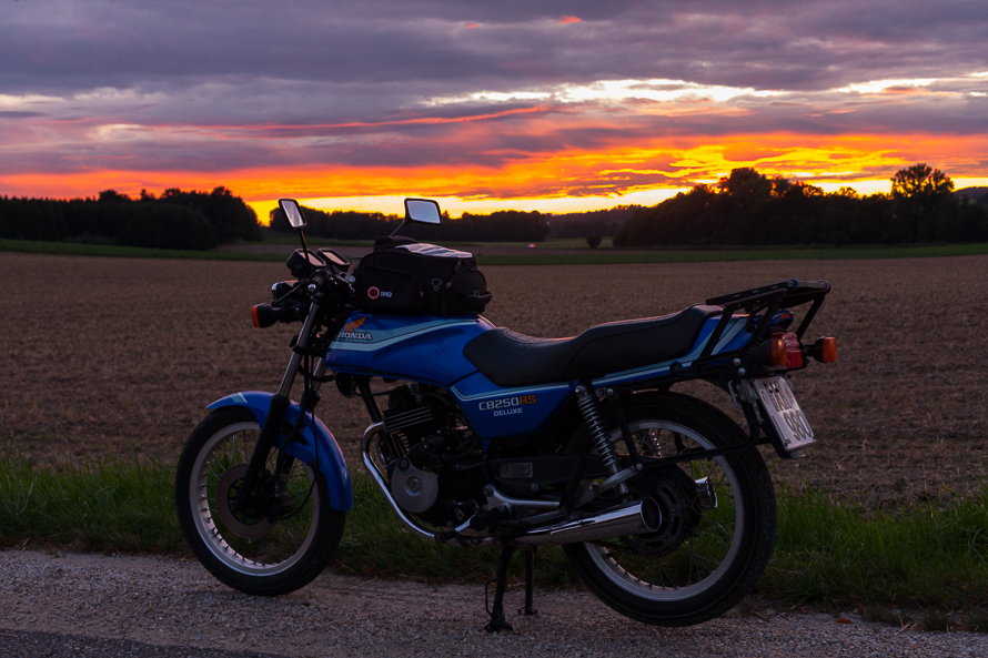 Mit dem kleinen Motorrad ist die Reise in den Sonnenuntergang noch viel einfacher. Flink, wendig und jeder Feldweg steht für die schönsten Motive offen. Die Temperaturen sind so angenehm, dass es eine wahre Freude ist, nicht zu warm im Fahrtwind, nicht zu kühl für dicke Kleidung.