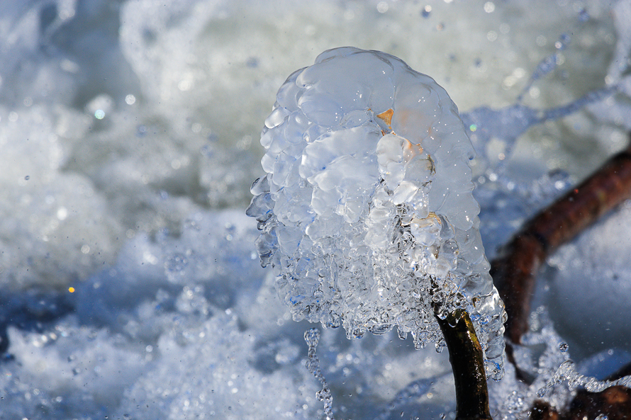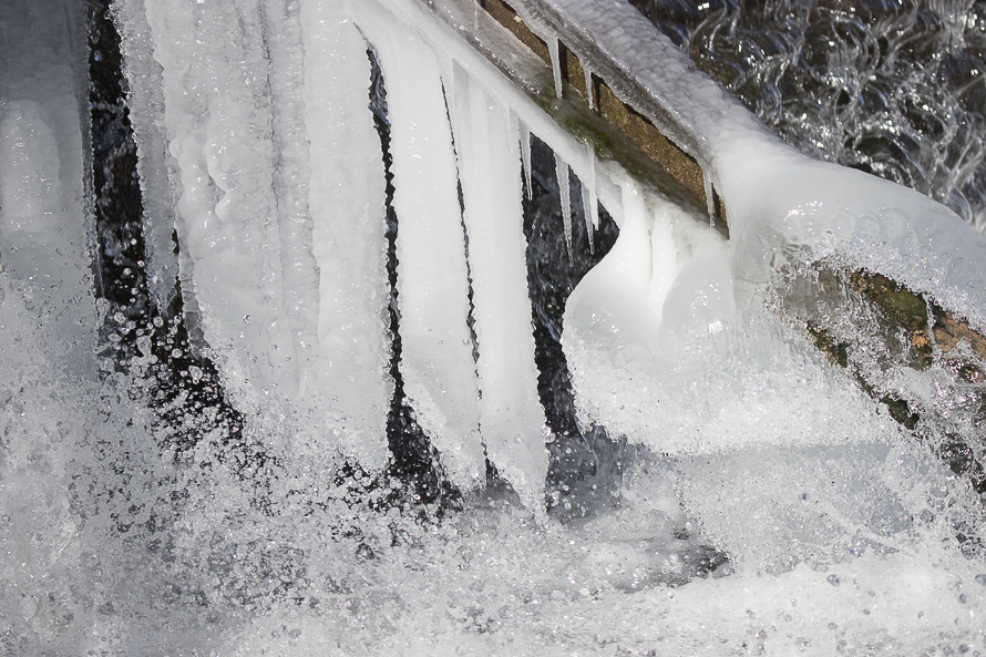 An der Wehranlage wird Wasser schnell bewegt und bildet genügend Wassertropfen in der Luft, um zu besonderen Formen zu erstarren und zu erfrieren. Dabei ergibt sich immer wieder der Kontrast von Wasser in den verschiedenen Aggregatzuständen und Bewegungszuständen.