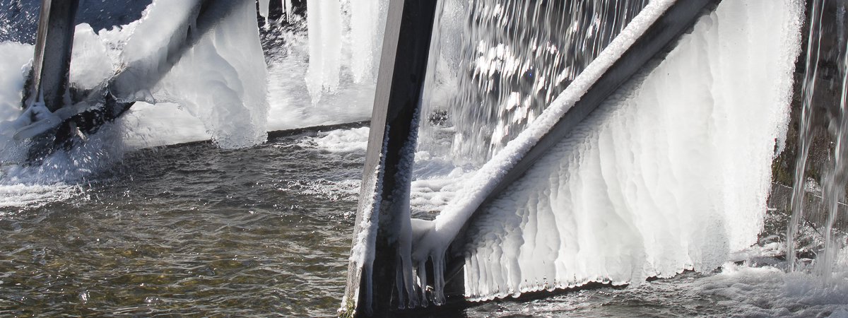 Wehranlage – Motivkontrast zwischen gefrorenem Wasser und schnell bewegtem Wasser