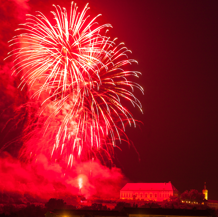 Das Brillant-Feuerwerk steigt vom Dachauer Hofgarten aus in den Nachthimmel über dem Dachauer Moos und begeistert die BesucherInnen auf dem Dachauer Volksfest.