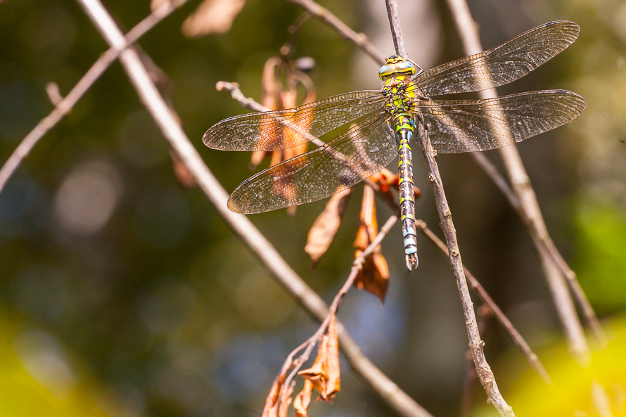 An diesem Tag verfolgte ich fotografisch gerade noch einen Schmetterling (Landkärtchen), als die Blaugrüne Mosaikjungfer vorbeiflog und ihre Kreise zog. Einen winzigen Augenblick später, entdeckte ich ebendiese Blaugrüne Mosaikjungfer an einem kleinen Ast hängend – so als wollte sich die Großlibelle in voller Größe mir fotografisch positionieren.