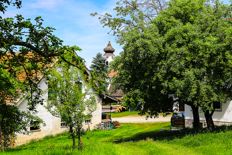 Die Kirche und der Bauernhof – ein großer und stattlicher Bauernhof muss das einmal gewesen sein. Heute ein wunderbares ländliches Fotomotiv zum Pfingstfeiertag. So schön kann das Dachauer Land sein.